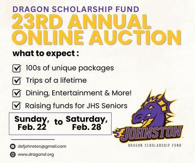 The Dragon Scholarship Fund (DSF) Online Auction is back—and it’s one of our biggest and most impactful events of the year. We invite you to register early, explore exciting auction packages, and support scholarships for Johnston High School seniors.